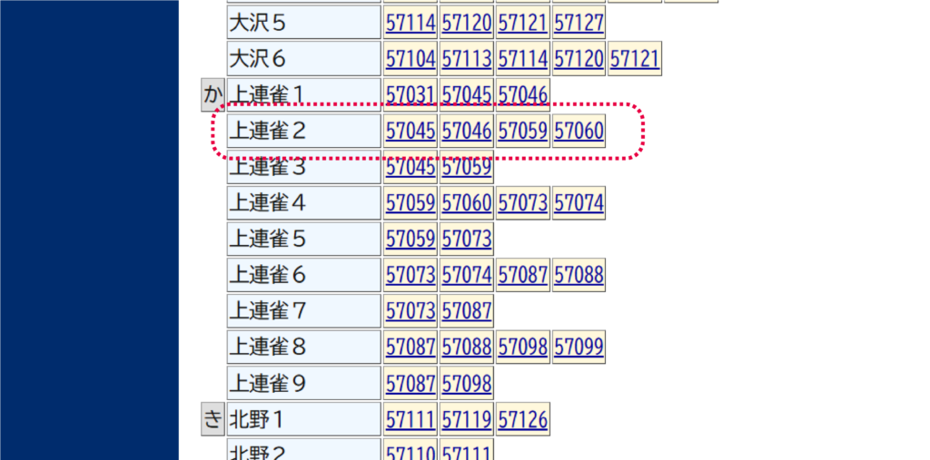 すると、上連雀2だけでも4つあることがわかります。この場合には、一度どれか1つを選択してクリックしてみてください。今回は左側の57045というものをクリックしてみます。