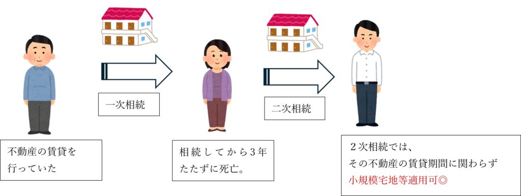 3年以内に相次相続(二次相続)があった場合は、貸付事業を行っていた年数、棟数や部屋数に関係なく、二次相続の相続人は、一次相続から引き継いだ貸付事業の用の宅地は小規模宅地等を適用できます。